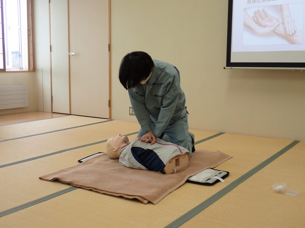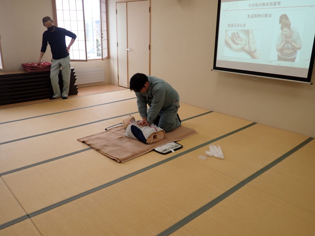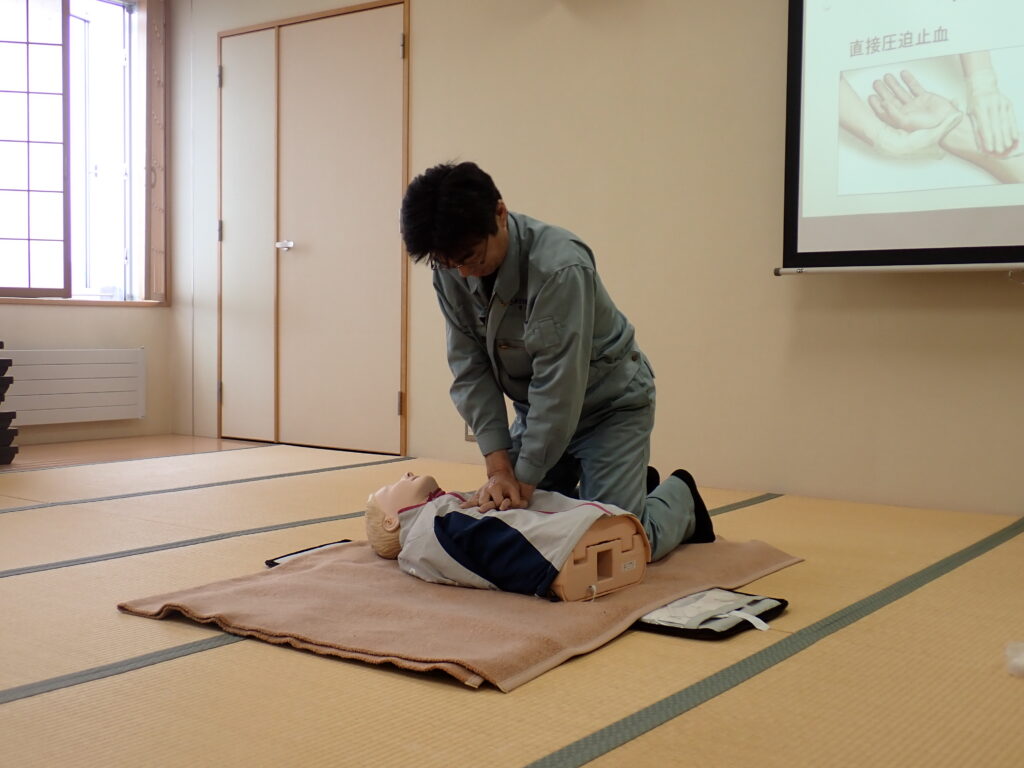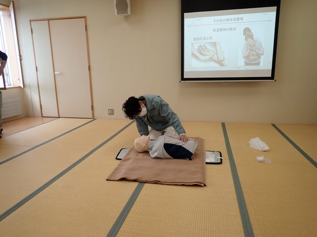 万が一の場面に備え、基本的な応急手当や心肺蘇生の方法について、実技を交えながら学びました。